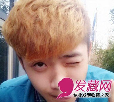 超有个性的纹理烫锅盖头短发,两边都剪短,将所有的厚重感摆放在头顶处,加上男生卖萌的表情,很可爱,个性、潮流的发型。