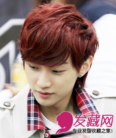 适合年轻男生的一款韩式潮男范儿短发发型,纹理烫打造出丰厚的发量感,亮眼的酒红色染发更显肤色白皙。