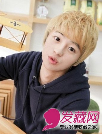 金色的发色,蓬松内扣的发型,这是一款适合韩范潮流男生的发型。会显得男生比较可爱,喜好萌系的男生可以试试。