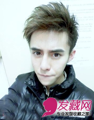 两鬓和后侧头发全剪短,长刘海打上发蜡往上吹出时髦造型,高耸的层次发丝个性张扬更显出潇洒男孩的一面。