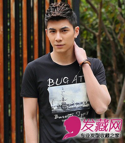 发型点评:发丝集中向前方冲出,一款会爆发的发型从此诞生。而它形成的“飞机”形状的阴影,却使得额头看起来特别阳刚、有气势。