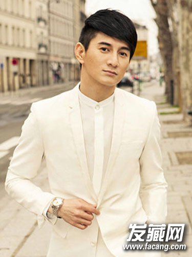 两边鬓发剪短,头顶头发往前梳,凸显立体五官,白色修身西装十分显气质。