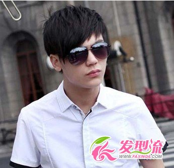 黑色的玉米烫,远看如直发,近看充满清晰的颗粒弧度,独特时尚,最适合学生GG们的男生烫发发型,大片的斜刘海,配上一款墨镜,充满夏秋的时尚休闲气场。