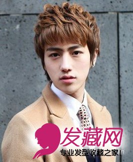 将顺直发与纹理烫发结合,极具层次感的发型让人从视觉上制造出吸引力。前额刘海直发短至眉际上方,显露出男生的浓眉大眼。头顶的发丝利用纹理烫技术,让发质更显蓬松。此款发型既贴合脸型线条,又为脸型过长的男生缩小了脸部面积。搭配英伦范服饰,更显贵公子的绅士气质。