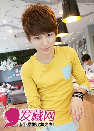 ,将发型表层的发丝打造出纹理烫的造型,在时尚中展现男生清新的秀气感,板栗色的