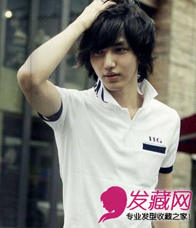 自然的发色,浓密的长发,带来年轻男生十足的健康感觉。三七分的长刘海向右侧偏斜,在发尾形成一个饱满的卷翘。整款长发包裹住双耳,与男生坚毅的脸部线条相连接,更显得俊朗和帅气。