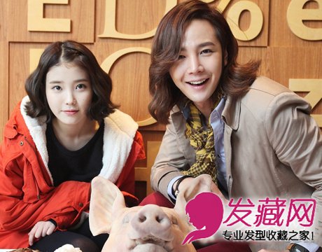 笑容温暖,时尚的长发烫发型,突出五官精致,休闲时尚装扮,与旁边的IU非常甜蜜般配