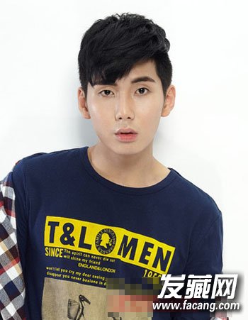 时尚的偏分造型设计与厚重的斜刘海相搭,颊光的造型设计清爽无疑,与头顶微显蓬松式的时尚定位烫造型相搭再配合清新自然的乌黑发色更添阳光帅气风。