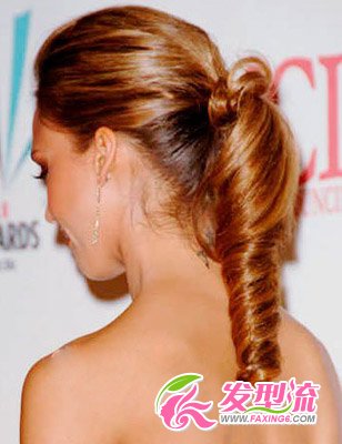 性感的后背加上造型感极强的一款螺旋卷马尾,看上去是不是特别的养眼呢?Jessica Alba金黄色的染发搭配耳际高的螺旋卷马尾,打造方面也非常的简单,将头发用大号发棒卷好用皮筋扎出一个合适的高度就完成了!