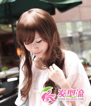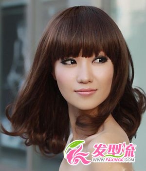 妩媚中长卷 斜刘海发型,总给人妩媚的感觉,可以有效减少脸颊的面积,同时可以拉长脸型的比较,适合圆脸形和大脸型的MM。浪漫的波浪大卷,倍添妩媚气息。深棕色的染发颜色,时尚感十足,在阳光的照耀下更加闪亮迷人!