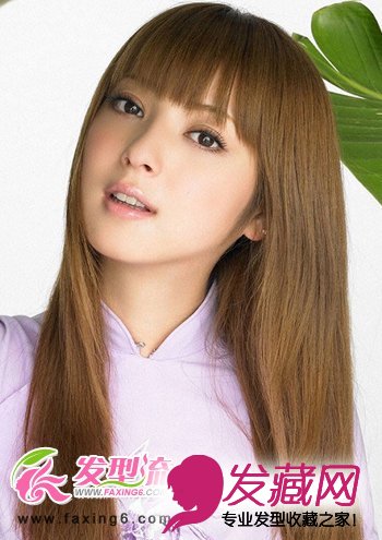 设计起到减龄装萌的效果,薄薄的齐刘海若隐若现遮住了双眉很好缩短了脸型,栗色的染发添加时尚气息衬托皮肤白皙,充满空气感的发丝如两条瀑布直泻而下。