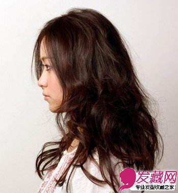 从侧面看这款长卷发,烫成不规则的卷发增加了发型的质感,深棕色的