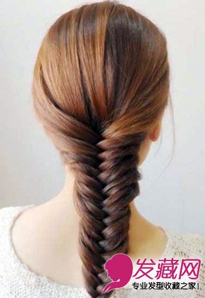 步骤5:最后用皮筋固定,编好之后,就是这样,鱼骨辫的基本编发就完成了。