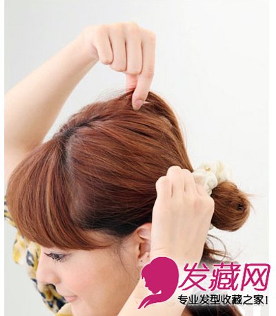 Step1:将头发分成上下两部分,上部分头发侧扎成马尾,用发圈扎头发的时候,扎到第三圈头发不要全部拉出来,剩出部分发尾,如图所示。然后用左手将头顶头发抓松。