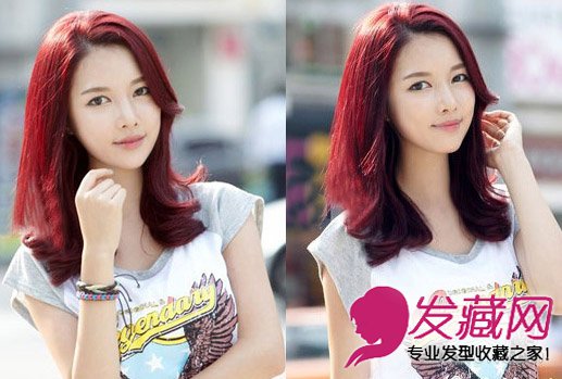 设计采用艳丽的酒红色染发颜色,侧分
