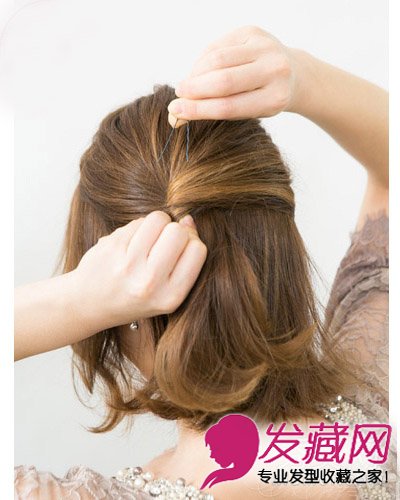 将发束进行扭转,用黑色的小发夹固定。(PS稍微的偏向一侧)