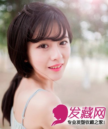 很有小清新范儿的简单发型扎发,低扎发辫打理出蓬松的随意感,韩式斜刘海透气修颜,演绎氧气MM。