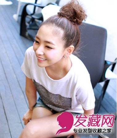 韩系女生最爱的简单韩式丸子头扎发,卷发妹纸打理这款扎发造型更显发髻的蓬松效果,露额无