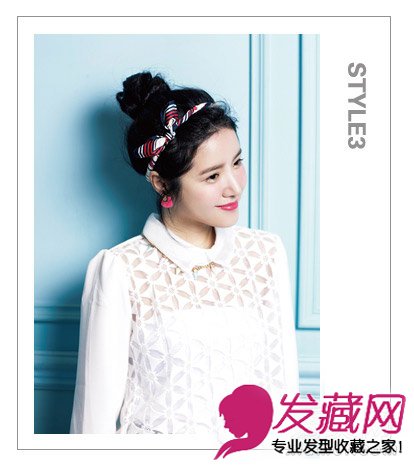 高耸的花苞头甜美清纯,头顶的发带与耳际的耳环遥相呼应,甜美感十足。