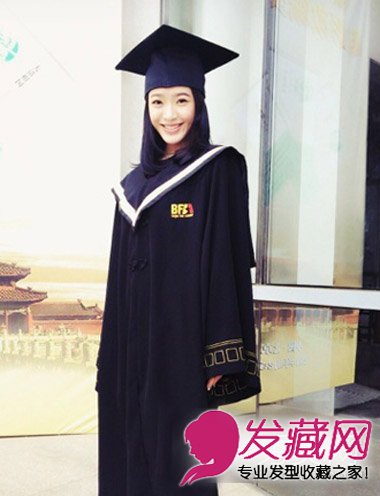 白雪毕业照,穿着学士服,戴学士帽,披肩的微卷发型,笑容洋溢,青春养眼。