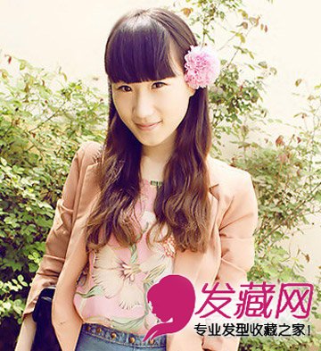 发型是不是很显可爱甜美风呢?只是简单的将长发做上微微的烫发造型,再与厚重的齐刘海相搭,无论什么脸型都可以修饰的哦,而侧边的一朵粉红色的花朵更显小女生的粉嫩感。