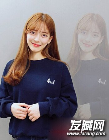 的发梢进行微微的蓬松烫发造型设计,再与明亮显眼的棕橘色染发相搭更显冬季温暖感与女生的青春活力感,清新的空气感刘海也为减龄加了不少分。