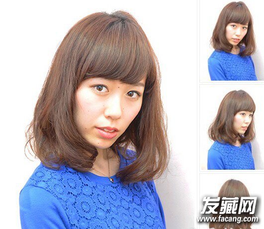 带有少许褐棕色的染发颜色加上发尾内卷的烫发造型将时尚的感觉完全展现出来,齐刘海显得很有可爱的感觉哦。