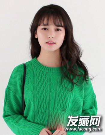 ,同样是清新的空气感齐刘海的设计,而与这种蓬松式的中长发烫发相搭更显女生的清纯气质风。