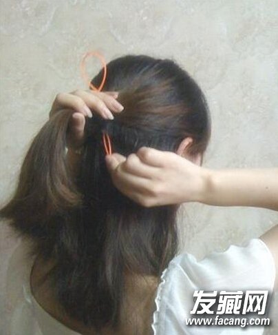 步骤4、盘发器的尖端从马尾的根部往下插入马尾;