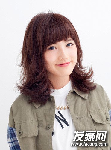 发型点评:这款发型推荐给圆脸MM们,厚重的刘海遮盖额头凸显出黑亮的双眼。卷翘的发尾可爱减龄。