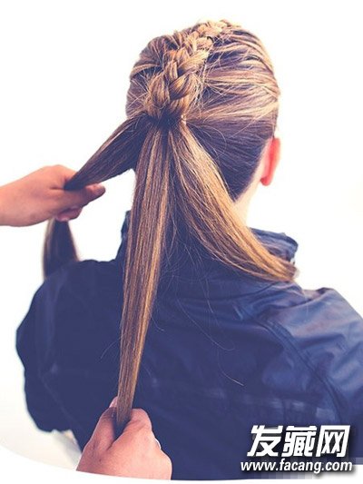 4.把法式辫倒夹在发顶上,将剩余的头发均匀地分成四等分。