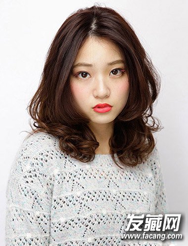 发型点评:这款中长发的修颜指数一流,螺旋烫卷发摆动在肩头,展现出浪漫性感气质。长刘海沿着下巴弧线内扣,瓜子脸呼之欲出。