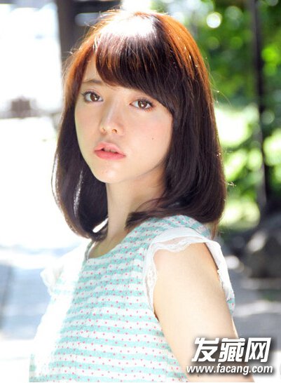 这款齐肩中长发相对于长发清爽很多,打理起来也十分方便,及眉的斜刘海露出一部分的额头和眉眼,拉长脸部线条,完美修脸,搭配内扣中长发尽显甜美气质。