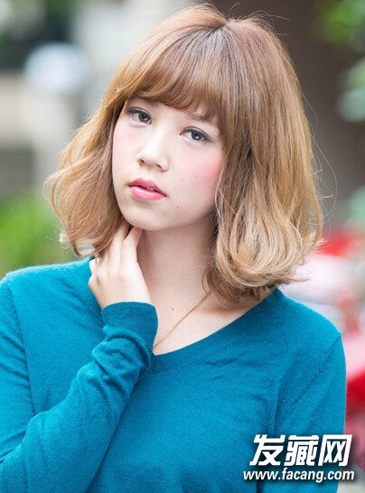 齐刘海发型是圆脸MM的瘦脸法宝,内扣齐刘海搭配蓬松卷曲的发尾修饰出一张巴掌小脸,齐肩长度清爽大方,渐变色染发让造型更时尚。