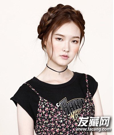 长发编成饱满的三股辫后缠绕在头顶,打造出花环