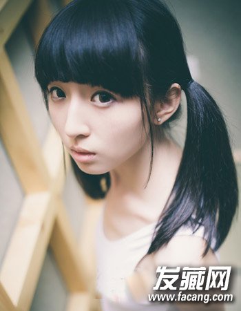 柔顺黑亮的中长直发发型,圆弧形的弧形刘海与双马尾扎发的设计勾勒出别致的时尚感来,清新灵动。
