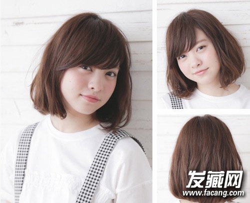 斜刘海搭配及肩中发轻松遮盖脸上小肉,让脸型变小,内扣设计提升甜美度,让妹子散发可爱气息。