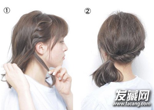 step2:将编织到耳后的辫子和后面的其他头发一起扭卷到另外一边的耳后,并用橡皮筋固定。