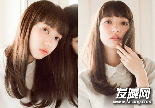这是一款非常日式的齐刘海长发,略厚重的齐刘海长到眉毛的位置,两颊的鬓发垂直贴着脸颊的线条而下很好的修饰了脸部线条的不足来突出脸部的美感,加上板栗色的染发更加显得优雅又清纯。