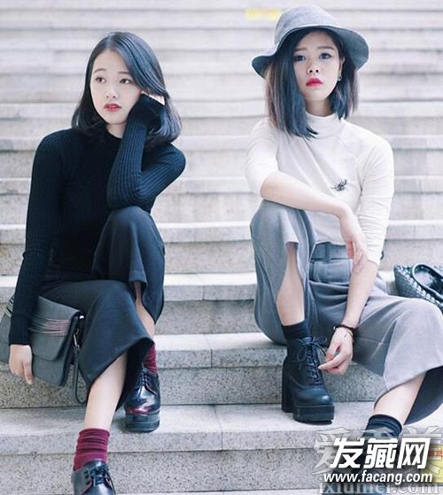 4、齐肩发型姐妹花,左侧是比较常见的齐肩发型,发尾采取内卷,会更有淑女的感觉,右侧是比较个性的齐肩发型,头发烫出蓬松感,脸在头发的衬托下更为小巧。