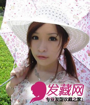 风情侧肩发 把头发扎起马尾,简约又不失时尚感。用侧扎的方式,更能突显MM的俏皮和可爱气息,惹人喜爱。头顶侧边别个可爱的帽子发饰,起到了画龙点睛的效果,为这个发型增色不少。细碎的刘海下一双水灵灵的大眼睛,足以秒杀男生。