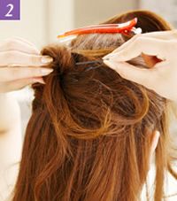 先将全部的头发稍微的烫卷一下。然后将头顶的头发取一些往前面夹住,再将两边的头发拧绕后用发夹夹在中间。