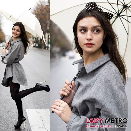 复古的波点蝴蝶结、灰色修身大衣、蕾丝袜 、高跟鞋 ,一切的一切如此和谐美丽,充满了法式时尚浪漫。