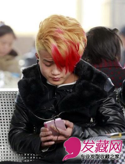 就像帽子一样藏住了他的脸,大红色的挑染造型让人感觉像打了鸡血一样!
