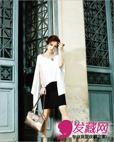 优雅的马尾发型,简洁利落的斜刘海的设计突出淡淡的女人味。