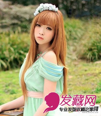 这是一款十足小萝莉的发型,齐腰的长发飘逸灵动,加上内扣的薄刘海,头顶的花朵装饰,周身散发出一种甜蜜浪漫气息。