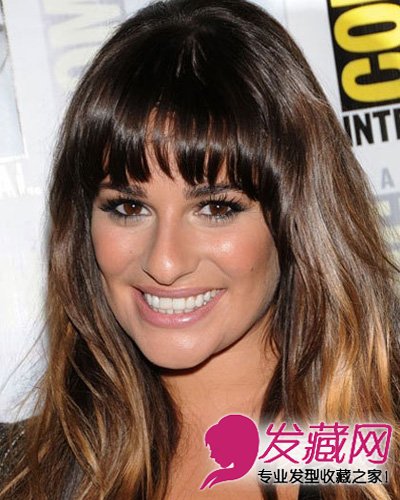 《欢乐合唱团》中的丽亚·米雪儿(Lea Michele)是一款长发造型,额头前的刘海两侧的头发很好 的修饰了脸型,这种简单的发型也能塑造出华丽与时髦感。