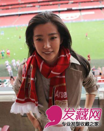 ,很随意的发型,将头发全都梳向后面,露出光洁的额头,带点蓬松的感觉,十分有韵味。