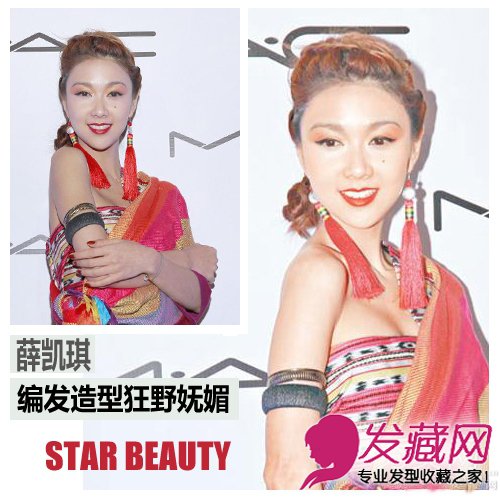 活泼搞怪的薛凯琪,她的编发也不失自己的风格。这一款属于短发编发,头发不太长的MM可以试试看哦。在刘海编造一个大大的麻花辫,高高隆起,延伸至发尾,再从两边发鬓各编一个麻花辫。这种大胆的编发不失美艳,更添一种野性的美。加上艳丽的妆容和这特别的耳坠,薛凯琪这个编发当真是大赚眼球啊!