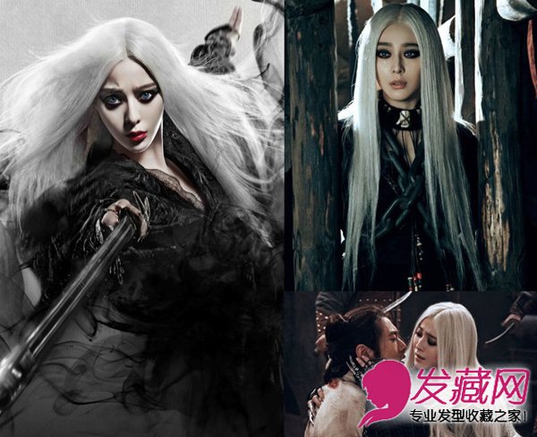 《白发魔女传之明月天国》剧中范冰冰一头飘逸的长直白发成为整部戏的亮点,银白色的发丝加上精致的烟熏眼影,鬼魅妖气,蓝绿色瞳孔透出魔女的野性与灵气。